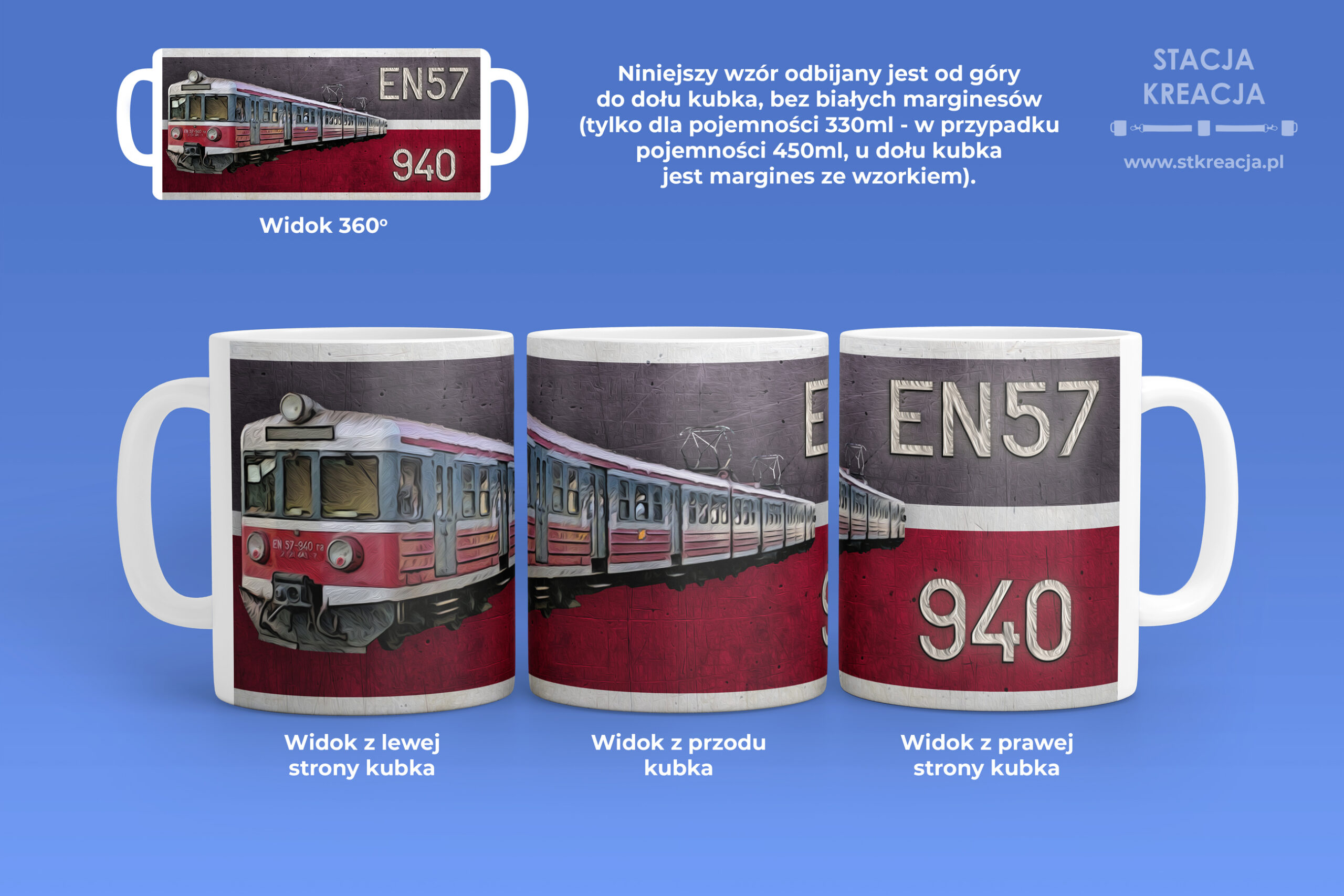 Podobnie jak inne kubki z tej serii, kubek wypełniamy wzorem od góry do dołu – bez białych marginesów. Dotyczy to wyłącznie pojemności 330ml – przy pojemności 450ml, na dolnej części kubka pozostanie białe tło z ozdobnym wzorkiem. Istnieje możliwość personalizacji numeru w prawym dolnym rogu (numer zostanie wtedy też zmieniony na samej lokomotywie).