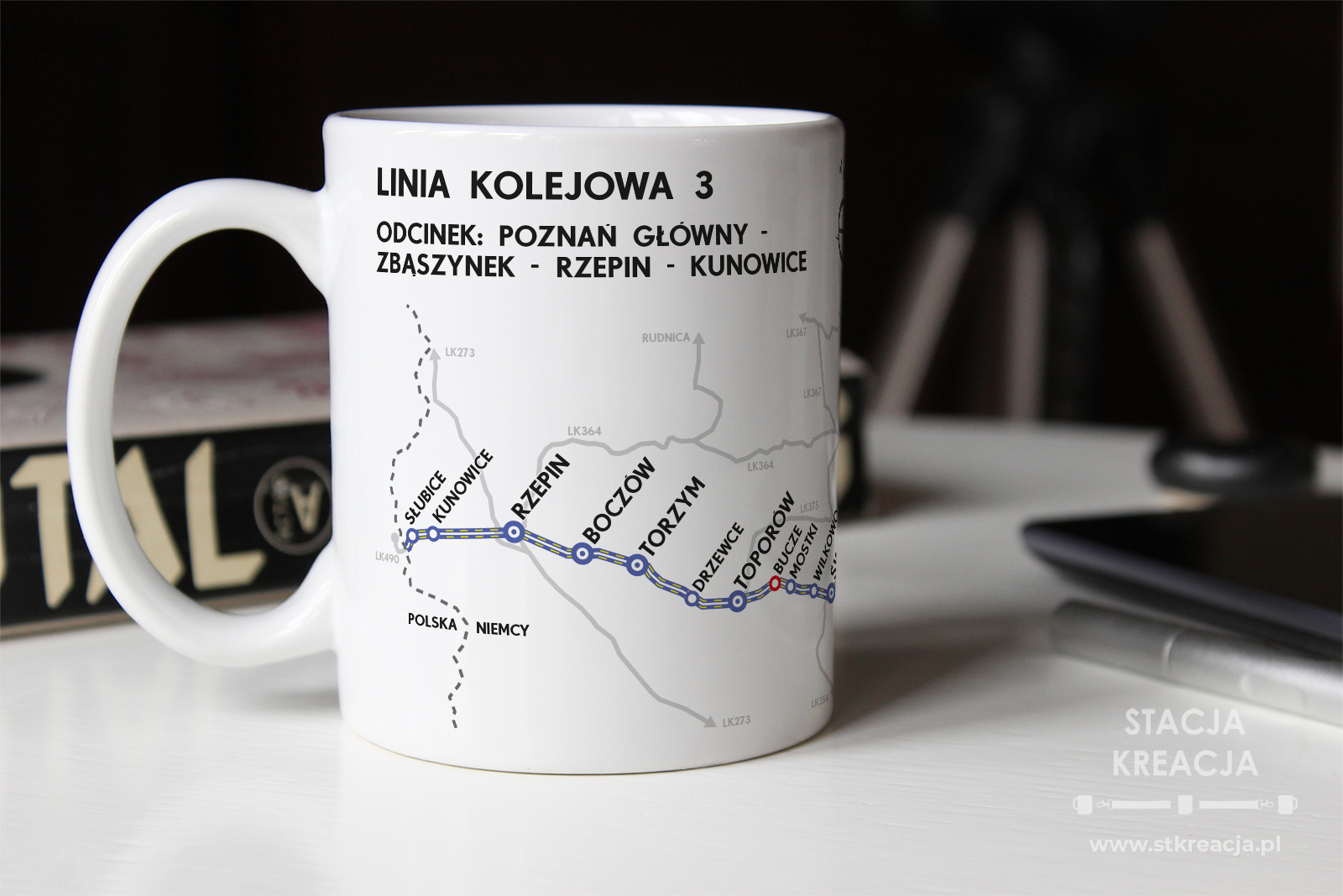 - Cała szerokość kubka – schematyczna mapka kolejowa: jeden z odcinków linii kolejowej 3 – Warszawa Zachodnia – Kunowice.