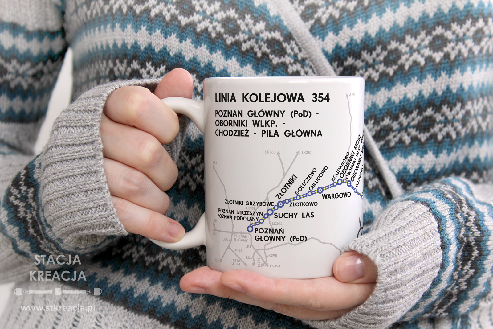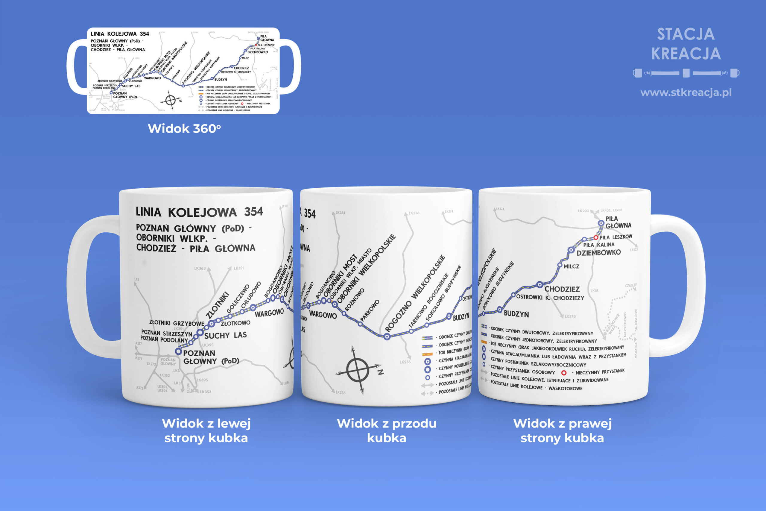 Linia kolejowa 354 – Poznań Główny – Piła Główna, Linia nr 354. Przedstawiamy kubek kolejowy z naszej serii „Linie Kolejowe”. Jest to seria kubków, na której prezentujemy schematyczne mapki linii kolejowych występujących w naszym kraju. Idealny gadżet, upominek dla fanów kolei i nie tylko. Schemat na kubku obejmuje całą długość linii kolejowej nr 354. Prezentowana linia kolejowa nie zaczyna się bezpośrednio od stacji Poznań Główny, a od pobliskiego posterunku Poznań Główny o oznaczeniu PoD. Stąd też, faktyczny przebieg linii, który podaliśmy na kubku to: Poznań Główny (PoD) – Oborniki Wielkopolskie – Chodzież – Piła Główna.