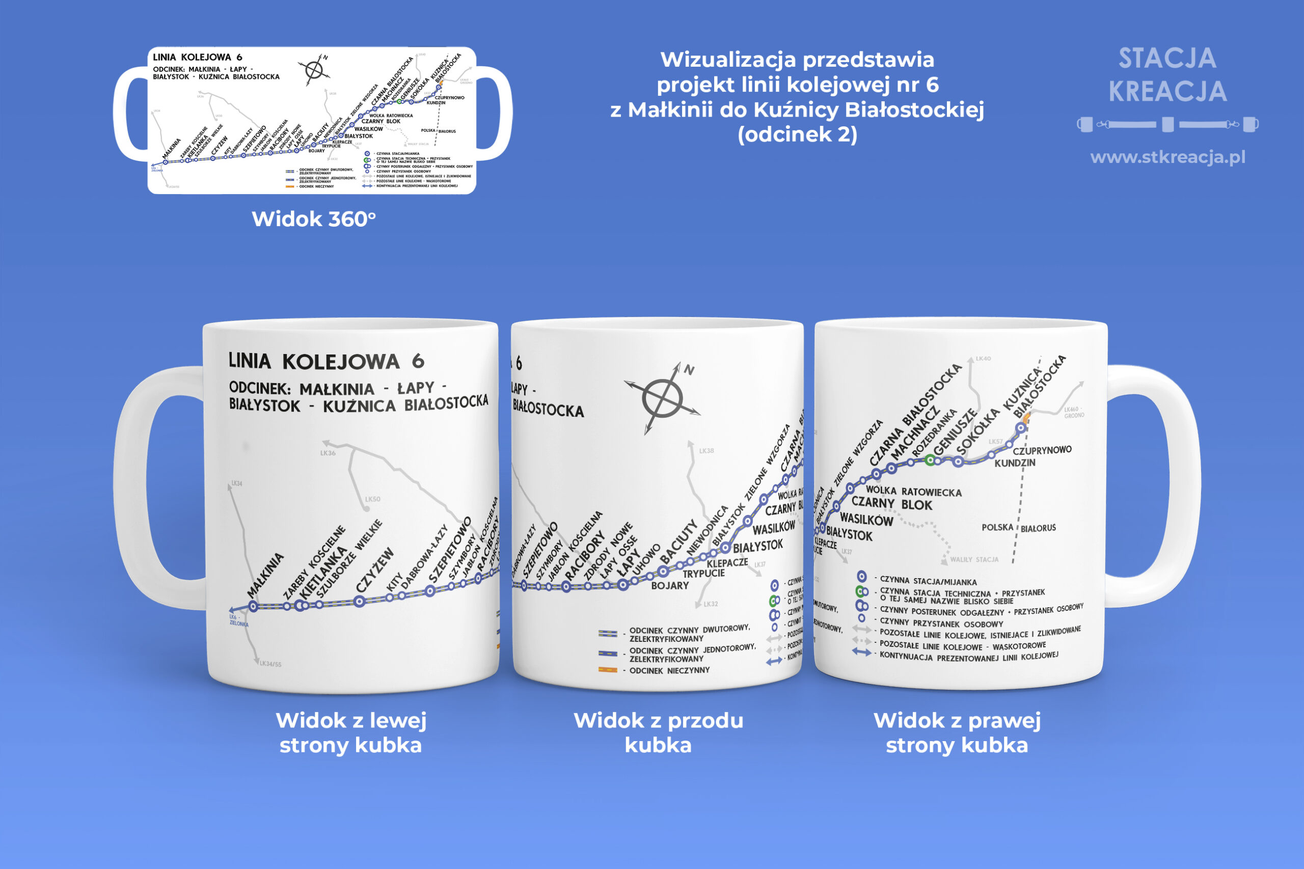 Linia kolejowa 6 oraz linie kolejowe 21 i 449 – Warszawa Wileńska / Warszawa Rembertów – Zielonka – Małkinia – Białystok – Kuźnica Białostocka, Linia nr 6. Przedstawiamy kubek kolejowy z naszej serii „Linie Kolejowe”. Jest to seria kubków, na której prezentujemy schematyczne mapki linii kolejowych występujących w naszym kraju. Idealny gadżet, upominek dla fanów kolei i nie tylko.