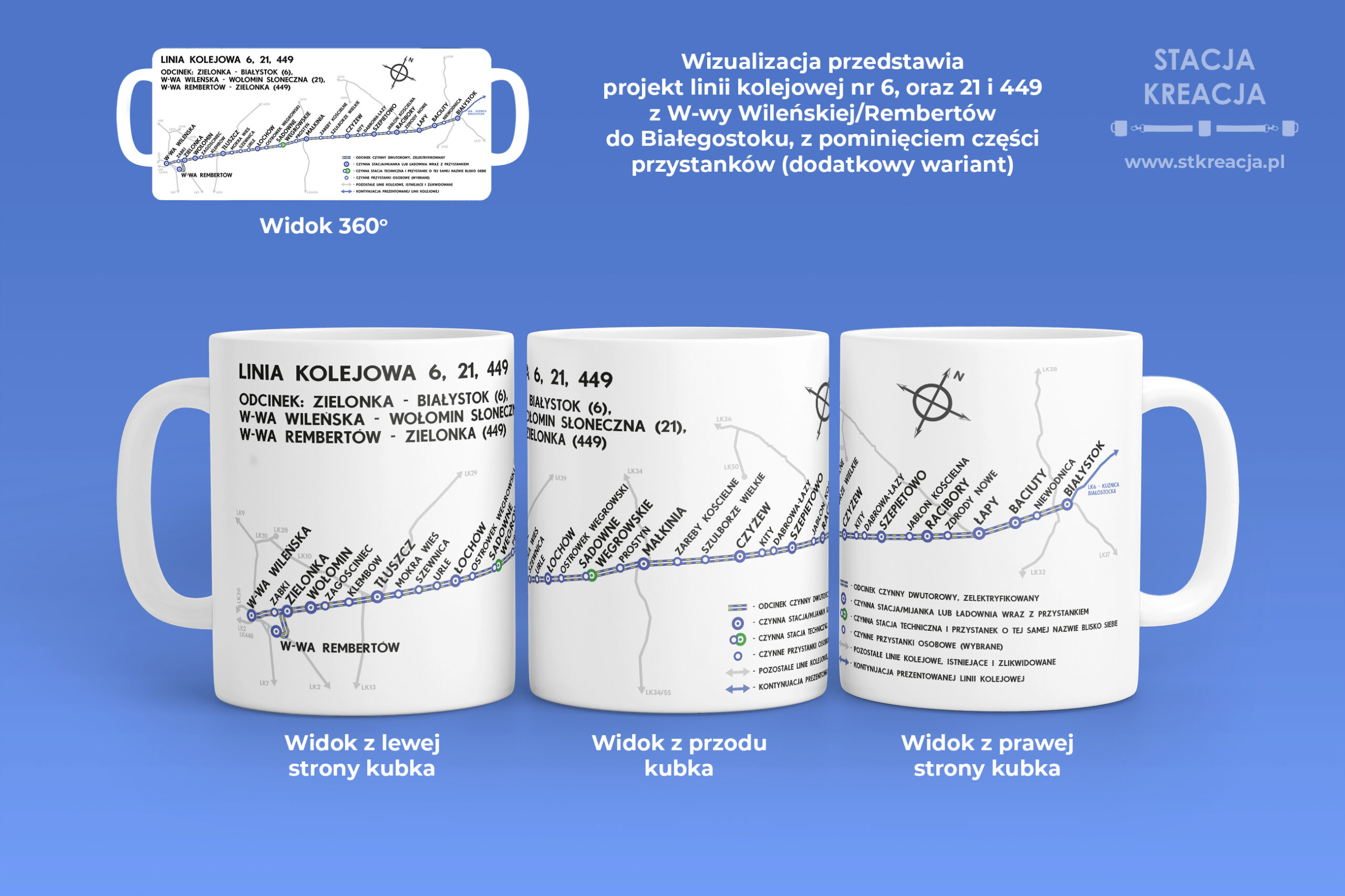 • Cała szerokość kubka – schematyczna mapka kolejowa: wybrany odcinek linii kolejowej 6  Zielonka – Kuźnica Białostocka, lub wariant z uwzględnieniem dodatkowo linii 21 i 449.