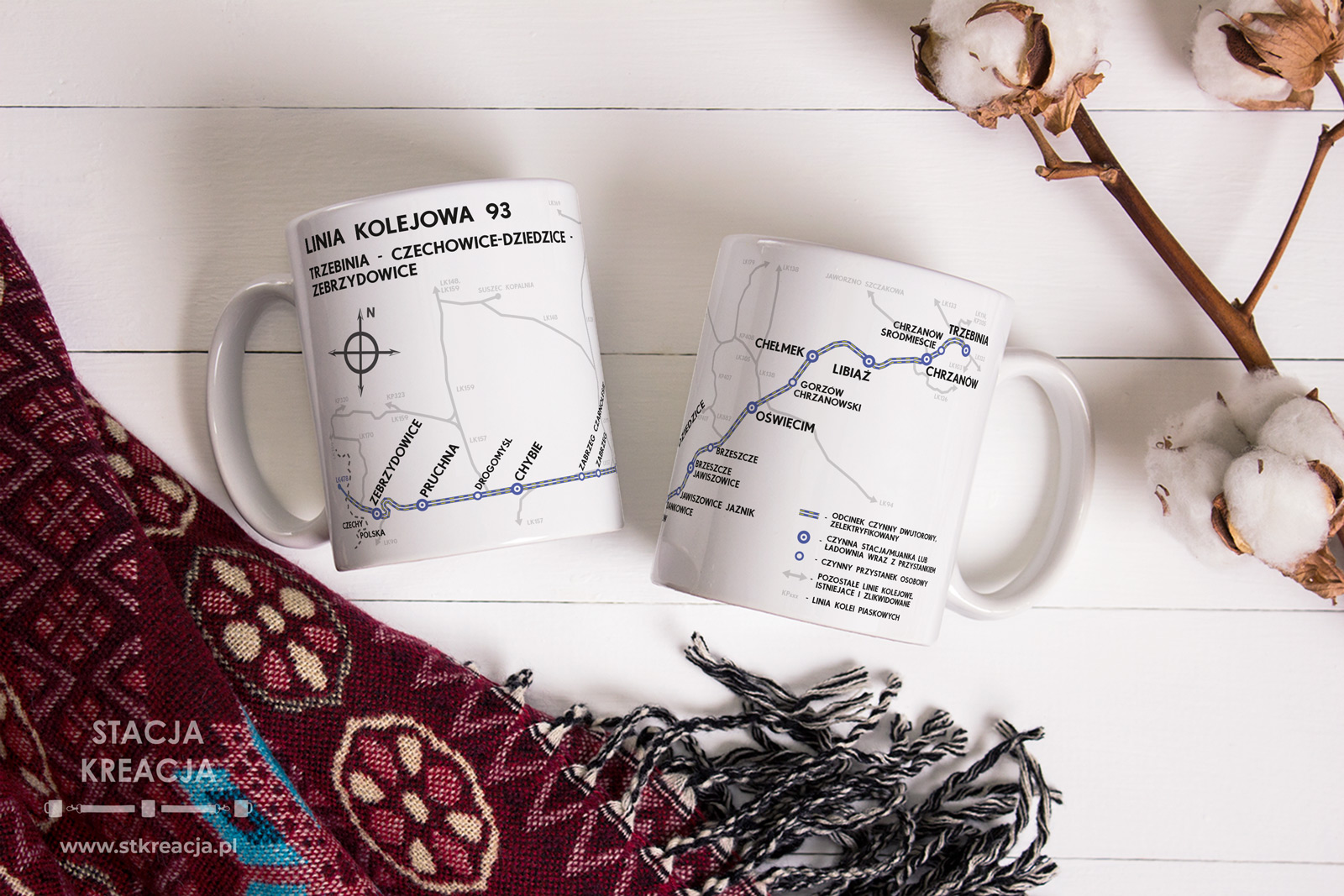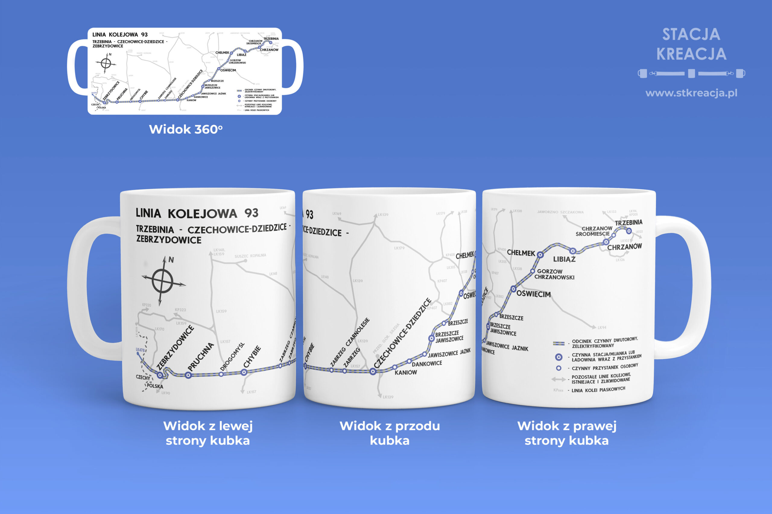 - Cała szerokość kubka – schematyczna mapka kolejowa: Linia kolejowa 93 – Trzebinia – Chrzanów – Oświęcim – Czechowice-Dziedzice – Zebrzydowice.