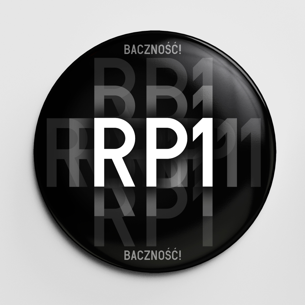 - Motyw grafiki na przypince/buttonie to: biały napis RP1 po środku, z efektem poruszenia i zanikania w cztery różne kierunki, z małymi napisami „Baczność!” u góry i u dołu, znajdująca się na czarnym tle.