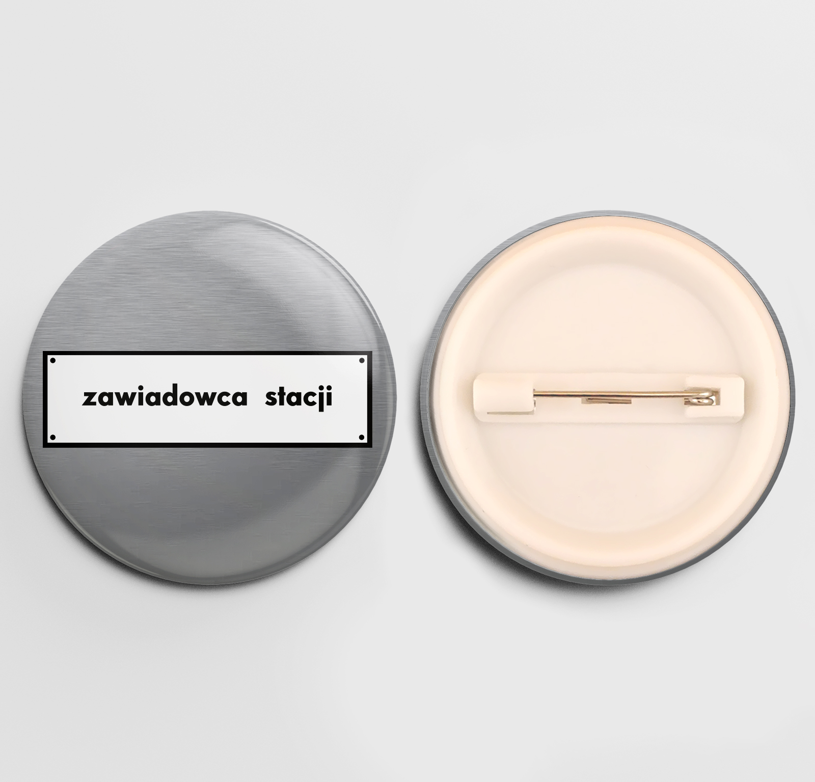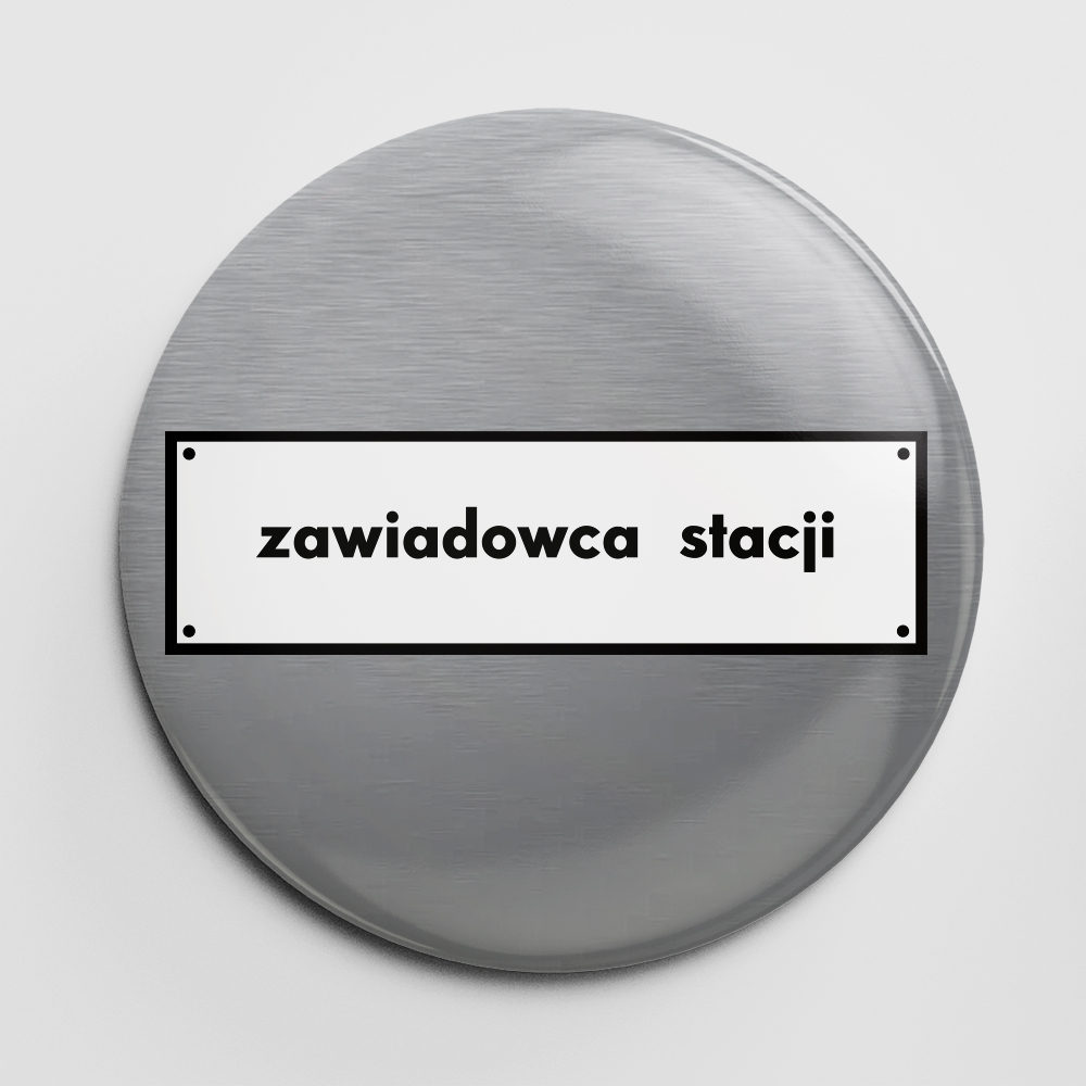 - Motyw grafiki na przypince/buttonie to: prostokątna, biała grafika, stylizowana na tabliczkę kolejową, z napisem „Zawiadowca Stacji”, znajdująca się na szarym tle.